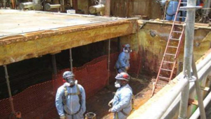 While the repair was successful, significant ground water ingress converted the molten sulfur to sulfurous acid — causing additional chemical sulfate attack on the remaining reinforced concrete members. Ultimately, the damage caused the pit roof to collapse and prompted the owner to opt for a full repair. STRUCTURAL crews removed one set of heating coils, four inches of accumulated sulfur cake, and the existing cast-in-place roof. Once the pit had been cleaned, a visual inspection was performed to assess the pit and offer final recommendations for repair.
